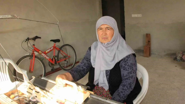 Antalya'nın Kumluca ilçesinde 71 yaşındaki Hüsniye Şahin, 1988 model örgü makinesi ile depremzedeler için atkı, bere ve lif örüyor.