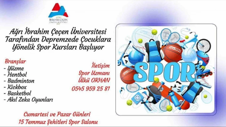 Ağrı İbrahim Çeçen Üniversitesi tarafından, Kahramanmaraş merkezli 11 ilimizi etkileyen depremin ardından Ağrı'ya gelen depremzede çocuklara çeşitli branşlarda spor kursları düzenlenecek.