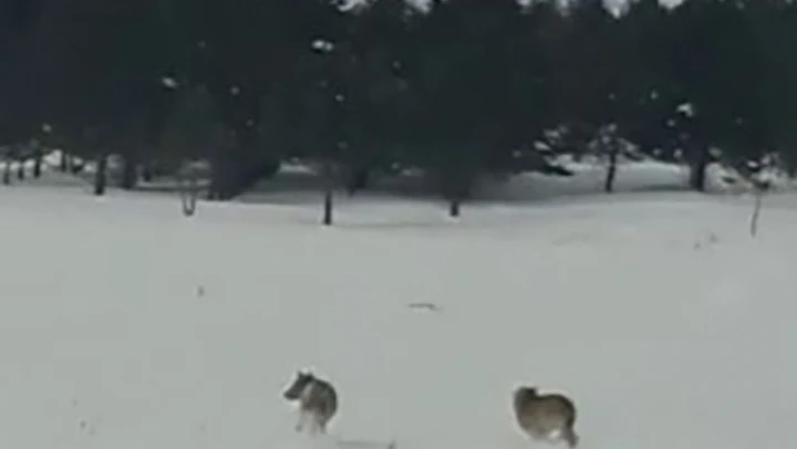Ardahan'da doğal yaşam alanlarında yiyecek bulmakta zorlanan kurt sürüsü, Çıldır Aktaş Sınır Kapısı Yolu Mozeret Geçidi'nde aracıyla seyreden Ardahanlı doğa tutkunu Çağdaş Keçeci tarafından cep telefonuyla görüntülendi.