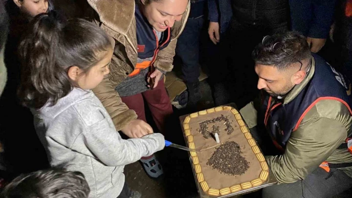 Kahramanmaraş merkezli deprem sonrası İzmir'den deprem bölgesine hareket eden Konak Nevvar Salih İşgören Eğitim Kampüsü-5 Mesleki Teknik Anadolu Lisesinin mutfak ekibi, Kahramanmaraş'ın Türkoğlu ilçesi Kınılı Mahallesi'ndeki afet çadırında depremzedelere yemek yapıyor. Ekip, depremde evleri yıkılan ve ailesiyle çadırda kalan 9 yaşındaki Gülsima Güler'e doğum günü sürprizi yaptı. Mehmet Dayıoğlu, Duygu Dayıoğlu, Zeki Birkan Uz, Nasuh Dumlupınar ve Serdar Bozkurt'tan oluşan mutfak ekibi önce pastayı özenle hazırladı, ardından çadır alanına giderek Gülsima'ya sürpriz yaptı. Gülsima, pastadaki mumu üflerken dilek de tuttu. O anlar, mutfak ekibinin cep telefonu kameralarına yansıdı.