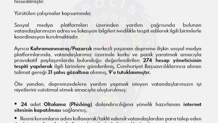 'Ayrıca Kahramanmaraş Pazarcık merkezli yaşanan depreme ilişkin sosyal medya platformlarında vatandaşlarımız üzerinde korku ve panik oluşturmak amacıyla provokatif paylaşımlarda bulunduğu değerlendirilen 274 hesap yöneticisinin tespiti yapılarak ilgili birimlere gönderilmiş, Cumhuriyet Başsavcılıklarınca alınan talimat gereği 31 şahıs gözaltına alınmış, 9'u tutuklanmıştır.'