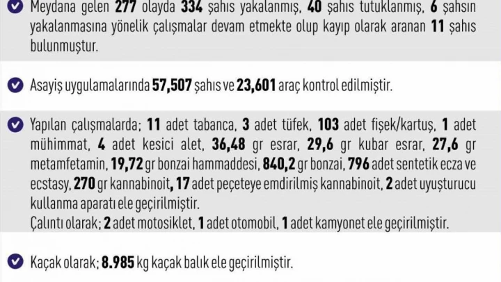Yapılan çalışmalarda; 11 adet tabanca, 3 adet tüfek, 103 adet fişek/kartuş, 1 adet mühimmat, 4 adet kesici alet, 36,48 gram esrar, 29,6 gram kubar esrar, 27,6 gram metamfetamin, 19,72 gram bonzai hammaddesi, 840,2 gram bonzai, 796 adet sentetik ecza ve ecstasy, 270 gram kannabinoit, 17 adet peçeteye emdirilmiş kannabinoit, 2 adet uyuşturucu kullanma aparatı ele geçirilmiştir. Çalıntı olarak; 2 adet motosiklet, 1 adet otomobil ve 1 adet kamyonetin, kaçak olarak ise 8 bin 985 kilo kaçak balık ele geçirildiği aktarıldı.