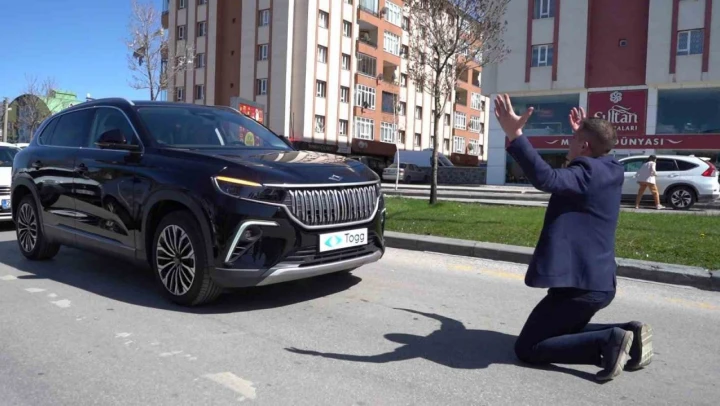 Erzurum'da şehir turu atan Togg vatandaşlardan yoğun ilgi gördü. Togg'un önüne diz çöken bir vatandaş, daha sonra arabayı öperek 'Şükürler olsun. Tam 100 yıl oldu' diyerek dua etti.