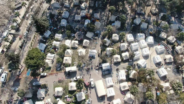 Hatay Millet Bahçesi'ne kurulan çadır kent havadan çekilen görüntüleri bile depremin etkisini gösteriyor.