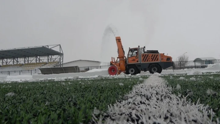 Muş'ta karla kaplanan sentetik futbol sahası, kar kaplanlarının yoğun çalışması sonucunda kar savurma aracı ile temizlendi. Beyaz örtüyle kaplanan sentetik çim yüzeyli futbol sahaları kardan temizlenerek önümüzdeki hafta oynanacak amatör lig maçları için kullanıma hazır hale getirildi.