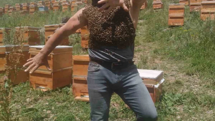 Karslı arıcı, adeta sınırları zorladı. Binlerce Kafkas arısını vücuduna alan vatandaş, adeta arı adam oldu.