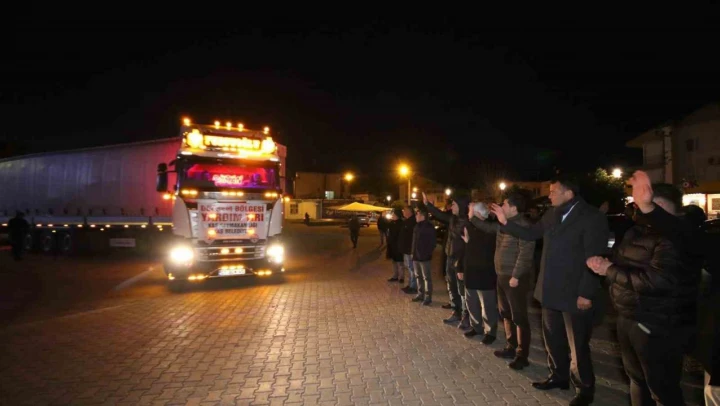 Antalya'nın Kaş Kaymakamlığı ve Kaş Belediyesinin organizasyonunda başlatılan yardım kampanyasında hazırlanan 9 tır, dualarla deprem bölgesine uğurlandı.