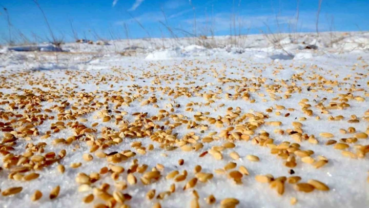 Malatya'nın Darende ilçesinde etkili olan kar yağışı sonrası yaban hayvanlarının beslenmesi için doğaya buğday ve ekmek bırakıldı.