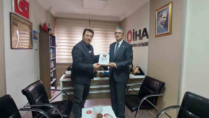 MHP Genel Başkan Yardımcısı Prof. Dr. Kamil Aydın ziyaretin sonunda İHA Bölge Müdürü Ayhan Türkez'e MHP kültür ve sanat yayınları kapsamında hazırlanan Türk Dünyası Çalgıları kitabını hediye etti.