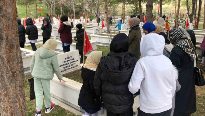 Programda okunan hatimlerin duası yapıldıktan sonra şehit mezarlarını gezen çocuklar, oradaki şehit aileleriyle beraber şehitlerin mezarları başında dua okudu.