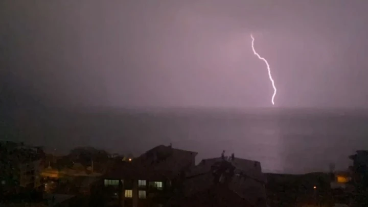Bitlis'in Ahlat ilçesinde etkili olan gök gürültülü sağanak yağışla birlikte Van Gölü'ne düşen şimşekler adeta geceyi gündüze çevirdi.