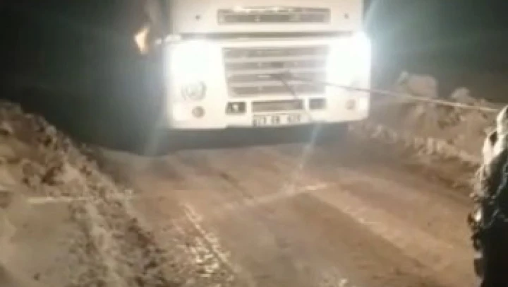 Elazığ'da kar ve buzlanmadan dolayı yolanda çıkan tır, İl Özel İdaresi ekipleri tarafından kurtarıldı.