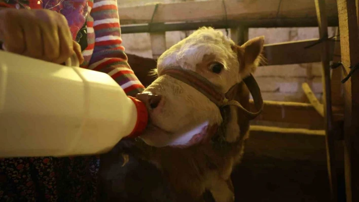 Annesi ölen buzağıyı elleriyle besliyorlar