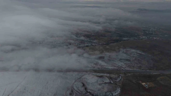 Elazığ'ın 4 bin yıllık Harput Mahallesi'nde kar yağışı başladı. Harput'a bağlı Nuralı köyünde dron ile kaydedilen görüntülerde, aynı rakımda hem karla kaplı alanlar, hem kar yağmayan bölgeler hem de yoğun sis dikkat çekti.