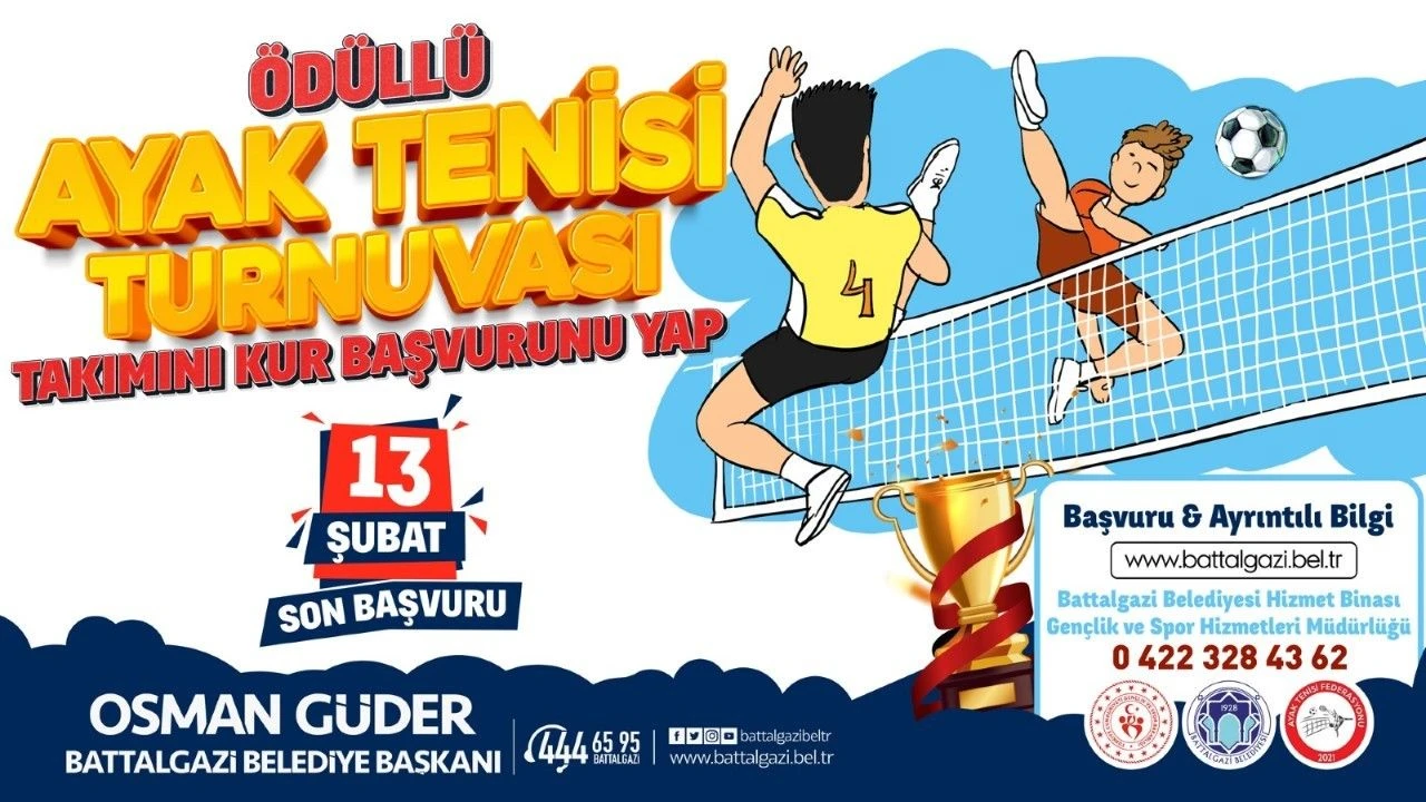 Malatya Battalgazi Belediyesi, bu kez de ödüllü 'Ayak Tenisi Turnuvası' düzenliyor. 15 yaş ve üzeri gençlerin 3'er kişilik takımlar halinde başvuru yapabileceği turnuvada son başvuru tarihi ise 13 Şubat olarak açıklandı.