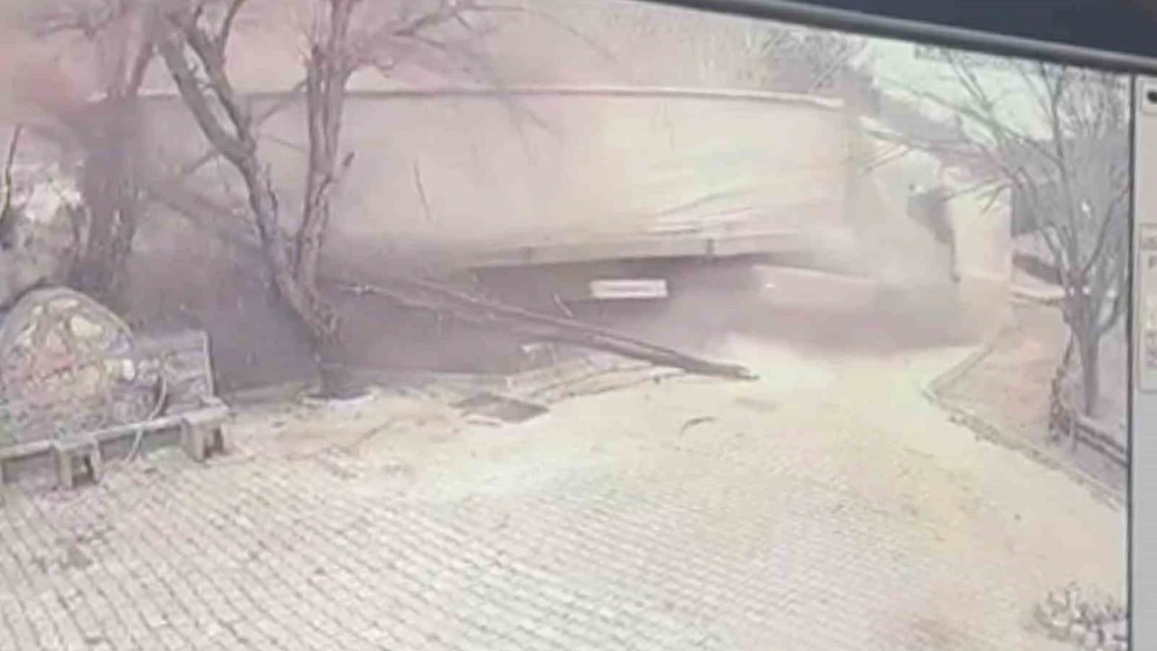 Boş araziye uçan yardım tırı kazası güvenlik kamerasına yansıdı