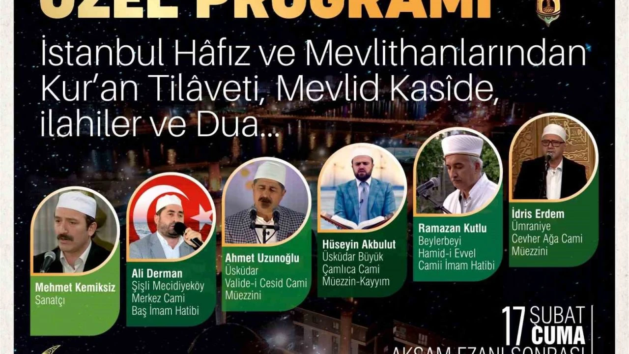 17 Şubat Cuma günü, Abdullah Paşa Cami’nde akşam namazı sonrası başlayacak programda; İstanbul hafız ve mevlithanlarından Kur’an-ı Kerim tilaveti, Mevlid-i Şerif, ilahiler ve dualar yer alacak.
