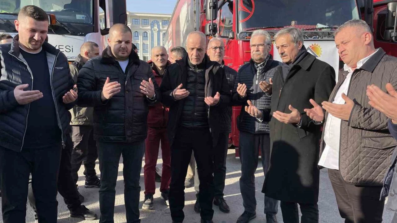 Deprem bölgesine giden yardım tırları dualarla uğurlandı