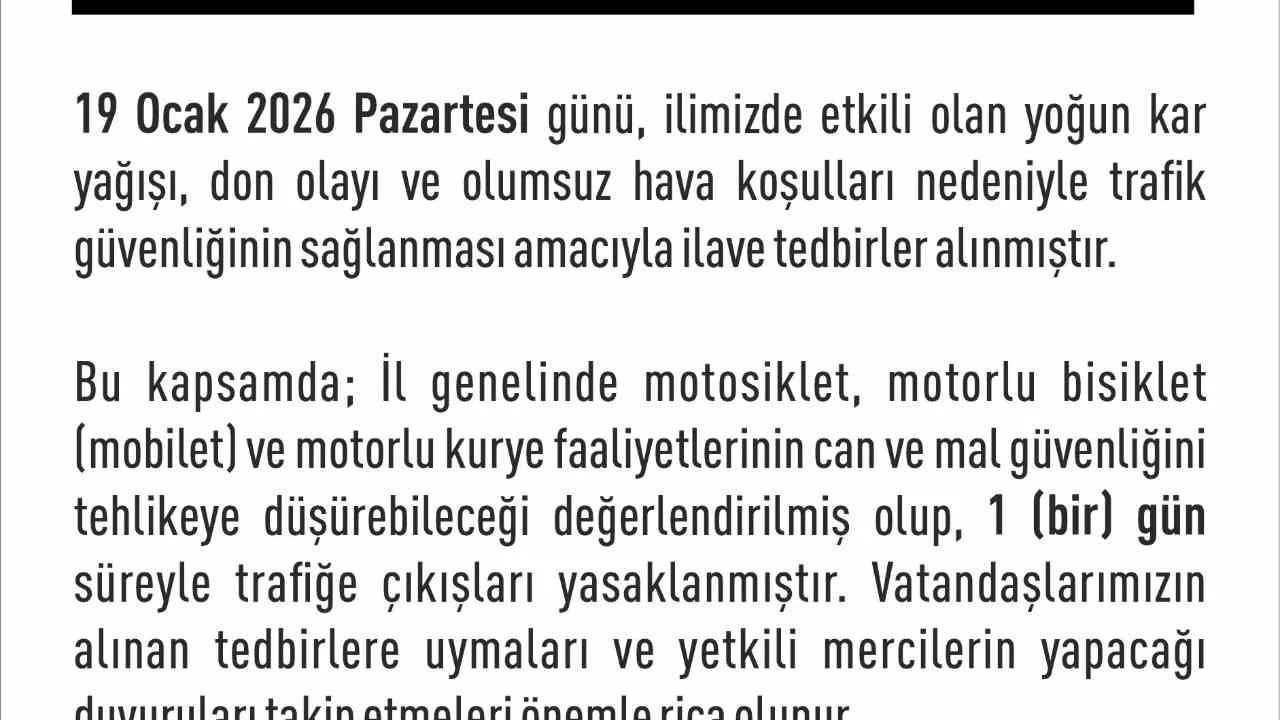 Elazığ Valiliği’nden yapılan açıklamada, "19 Ocak 2026 Pazartesi günü, ilimizde etkili olan yoğun kar yağışı, don olayı ve olumsuz hava koşulları nedeniyle trafik güvenliğinin sağlanması amacıyla ilave tedbirler alınmıştır. Bu kapsamda; İl genelinde motosiklet, motorlu bisiklet (mobilet) ve motorlu kurye faaliyetlerinin can ve mal güvenliğini tehlikeye düşürebileceği değerlendirilmiş olup, 1 (bir) gün süreyle trafiğe çıkışları yasaklanmıştır. Vatandaşlarımızın alınan tedbirlere uymaları ve yetkili mercilerin yapacağı duyuruları takip etmeleri önemle rica olunur" denildi.