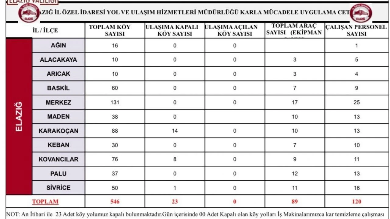Elazığ’ın yüksek kesimlerinde etkili olan kar yağışı nedeniyle 23 köy yolu ulaşıma kapandı. Elazığ İl Özel İdaresi ekipleri, 89 araç ve 120 personelle kapalı yolların açılması için çalışmalarını sürdürüyor.