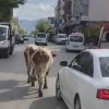 Elazığ’ın Karakoçan ilçesinde iki inek ilçe merkezine indi. Caddede gezen inekler sürücülere zor anlar yaşattı.