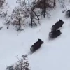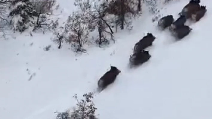 Elazığ’ın Ağın ilçesinin yüksek rakımlı bölgesinde ağaçlık alanda gezen domuz sürüsünü görüntülendi. Keban Baraj Gölü’nün üst kısmında karların arasında domuzları gören vatandaş, bir süre dronla domuzları takip etti. Doğada koşan sürü, bir süre sonra gözden kayboldu.