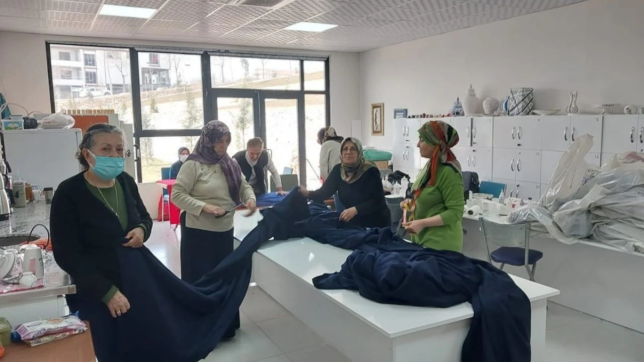 Elazığ Belediyesi, Ekonomi Geliştirme Merkezi (EBEGEM) bünyesinde bulunan çinicilik kursu hocaları ve kursiyerler, battaniye, şal ve panço gibi ürünler yaparak deprem bölgesine gönderiyor.