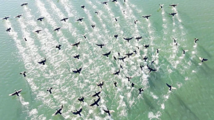 Elazığ'da etkisini sürdüren soğuk hava ve kar yağışı, Cip Baraj Gölü'nde yaban hayatına dair kartpostallık görüntüler ortaya çıkardı. Kara batakların su üzerinde ilerleyip gökyüzüne yükseldiği anlar dron ile kaydedildi.