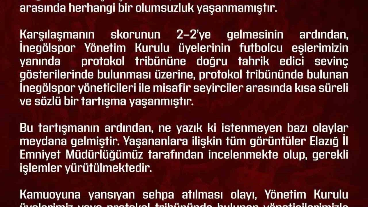 Elazığspor Kulübü, İnegölspor maçında protokol tribünde yaşanan olaylar hakkında bir açıklama yaptı.