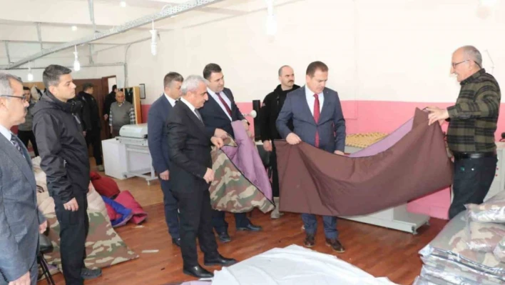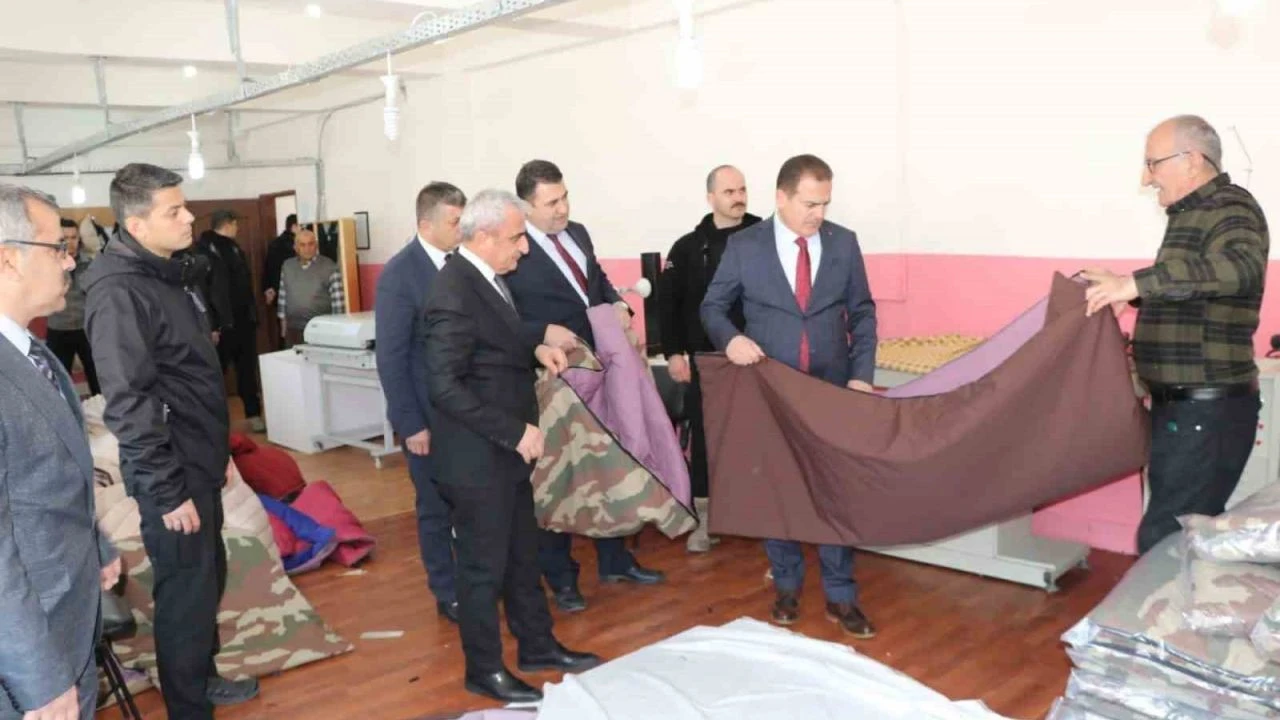 Hakkari Valisi ve Belediye Başkan Vekili İdris Akbıyık, Kahramanmaraş merkezli depremlerden etkilenen vatandaşlar için üretilen uyku tulumu atölyesini ziyaret etti.