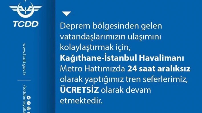 TCDD’den yapılan paylaşımda, “Deprem bölgesinden gelen vatandaşlarımızın ulaşımını kolaylaştırmak için, Kağıthane - İstanbul Havalimanı Metro hattımızda 24 saat aralıksız olarak yaptığımız tren seferlerimiz ücretsiz olarak devam etmektedir” denildi.