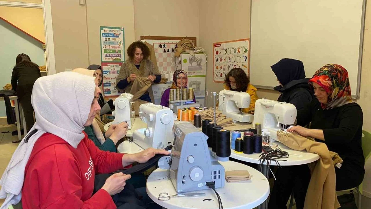 Kartal’da depremzedelere destek için bir araya gelen ev hanımları tek yürek olarak, depremzedeleri sıcak tutacak kıyafetler dikmeye başladı.