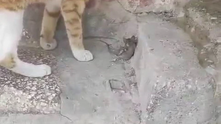 Elazığ'da kediyle farenin kovalamacası cep telefonu kamerasına yansıdı. Fare, kediye yem olmaktan ölü taklidi yaparak kurtuldu.