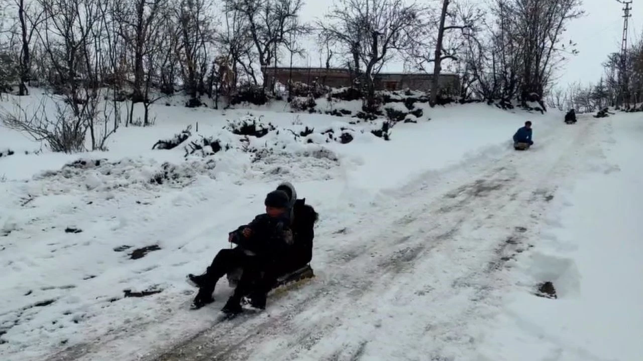 Gevaş’ta dün geceden beri etkili olan kar yağışı hayatı olumsuz etkilerken, ilçeye bağlı Elmalı Mahallesi’nde bir araya gelen çocuklar ise kendi imkanlarıyla yaptıkları kızaklarla kaymanın keyfini yaşadı. Soğuğa aldırış etmeden kaymanın keyfini süren çocuklar, Artos Dağı eteklerinden başlayarak evlerinin önüne kadar kayıyor. Yaşları 8 ile 16 arasında değişen çocuklar, sömestr tatili olması nedeniyle zamanlarını kızakla kayarak geçirdiklerini dile getirdiler. Kızak keyfini yaşayan çocuklar, "Arkadaşlarla keyifli bir gün yaşıyoruz" ifadelerini kullandılar.