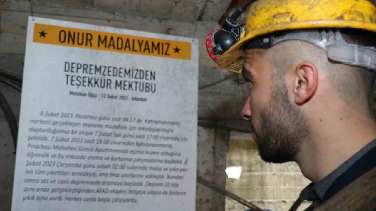 Zonguldak’tan gönüllü olarak deprem afetinin yaşandığı bölgeye giderek enkazdan pek çok can kurtaran maden işçileri, kendileri için yazılan teşekkür mektubunu “onur madalyası” diye çalıştıkları madenin girişine astı. İşçiler, madene her girişlerinde kurtardıkları canları hatırlıyor.