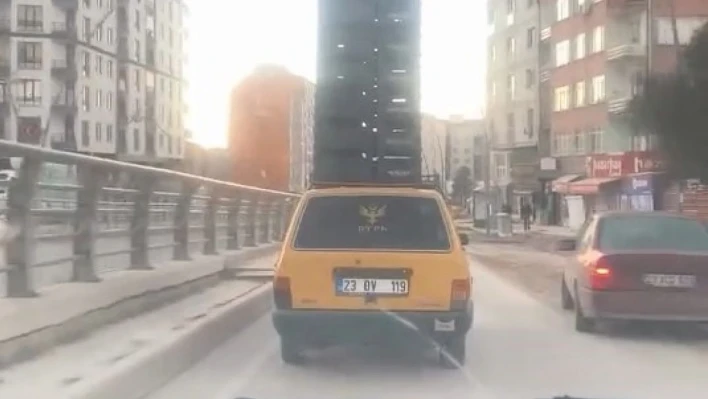 Elazığ kent merkezinde kaydedilen görüntülerde, otomobil sürücüsü aracının tavanına meyve ve sebze kasalarını üst üste koyarak taşıdı. Trafik kurallarını ihlal edip standardın üzerinde yük taşıyan şahıs, trafiği tehlikeye soktu. Kimseye aldırış etmeden ilerleyen sürücü, gören vatandaşları hayrete düşürdü.
