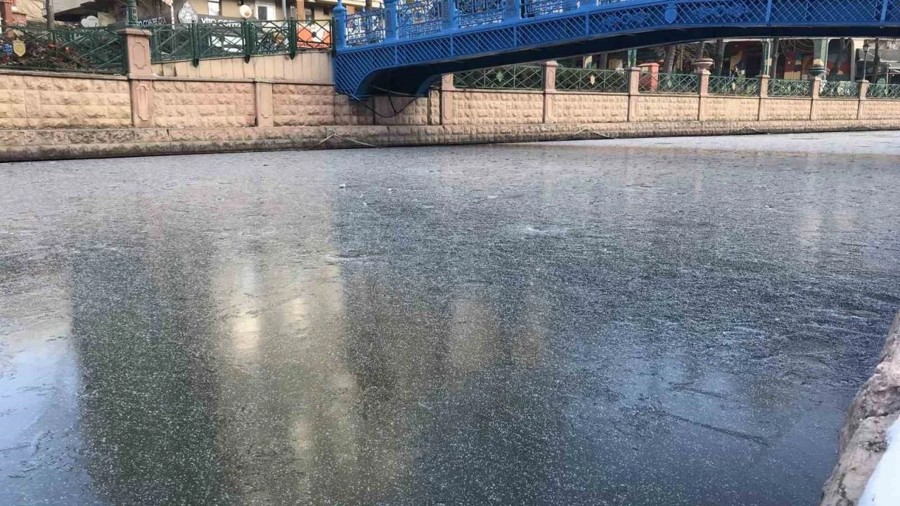 Eskişehir’de etkili olan soğuk hava, porsuk çayının yüzeyini yeniden dondurdu.