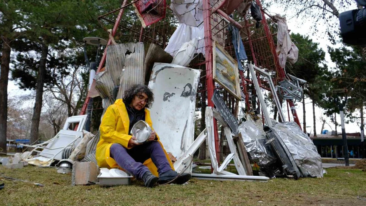 Erzincan’da profesör deprem bölgesindeki enkazlardan topladığı malzemelerden yaptığı çalışmayı şehrin en işlek caddesinde sergileyerek farkındalık oluşturdu.