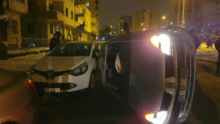 Kayseri'nin Melikgazi ilçesinde refüje çarpan otomobil, park halindeki aracın üzerine devrildi.