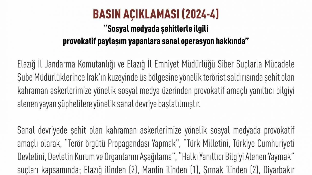Konu ile ilgili Elazığ Valiliğinden yapılan açıklamada, “Sosyal medyada şehitlerle ilgili provokatif paylasim yapanlara sanal operasyon hakkında, Elazığ il Jandarma Komutanlığı ve Elazığ İl Emniyet Müdürlüğü Siber Suçlarla Mücadele Şube Müdürlüklerince Irak’ın kuzeyinde üs bölgesine yönelik terörist saldırısında şehit olan kahraman askerlerimize yönelik sosyal medya üzerinden provokatif amaçlı yanıltıcı bilgiyi alenen yayan şüphelilere yönelik sanal devriye başlatılmıştır.