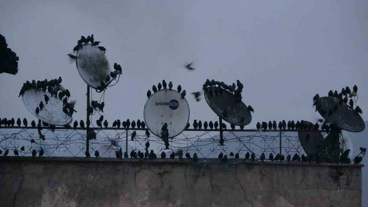 Hakkari’nin Yüksekova ilçesinde binaların çatılarına sürü halinde konan sığırcık kuşları, ilginç görüntüler oluşturdu.