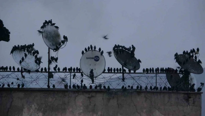 Hakkari'nin Yüksekova ilçesinde binaların çatılarına sürü halinde konan sığırcık kuşları, ilginç görüntüler oluşturdu.