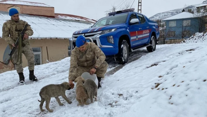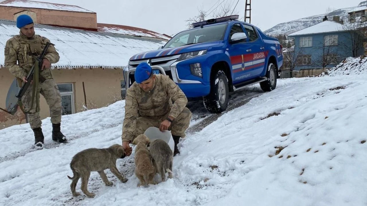Tunceli'nin Pülümür İlçe Jandarma Komutanlığı personeli, yoğun kar yağışının ardından sokak hayvanları için kulübe yapıp mama dağıttı.