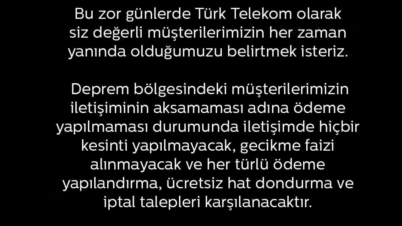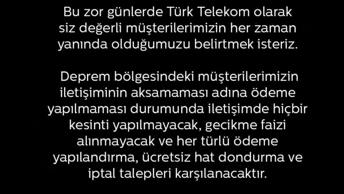 Deprem bölgesindeki müşterilerimizin iletişiminin aksamaması adına ödeme yapılmaması durumunda iletişimde hiçbir kesinti yapılmayacak, gecikme faizi alınmayacak ve her türlü ödeme yapılandırma, ücretsiz hat dondurma ve iptal talepleri karşılanacaktır.’’