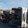 Viraja hızlı giren tır devrildi, sürücüsü yaralandı