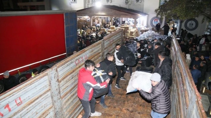 Balıkesir'in Edremit ilçesinde Kahramanmaraş başta olmak üzere 10 ilde meydana gelen deprem felaketi bölgesine gönderilecek yardımların TIR'lara yüklenmesi için yüzlerce gönüllü bir araya gelerek insan zinciri oluşturdular.
